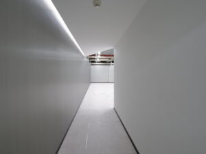 ショールームの隣には打ち合わせが出来る会議室も用意されており、会議室とショールームはトンネル状の通路を使って移動するため、ショールームに抜けた時の印象がより強くなるよう演出しています。